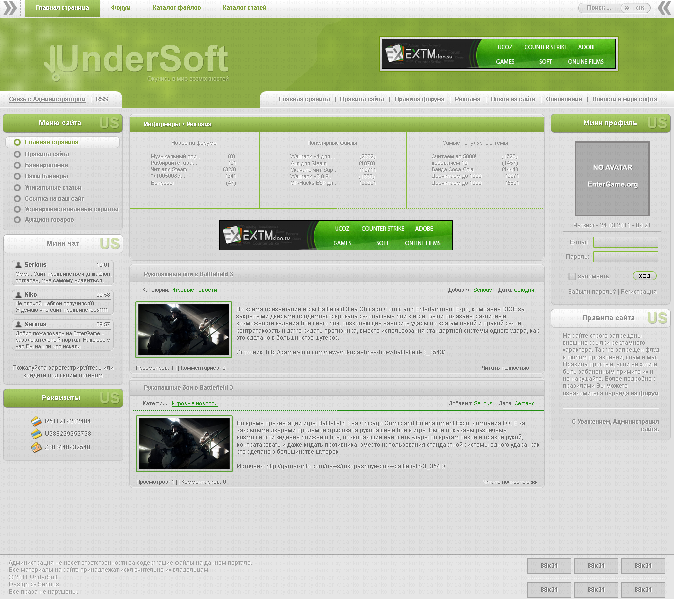шаблон EnterGame, и вправду, ведь их создавали одни и те же люди. Вебмастерам, планирующим создавать варезник, я бы порекомендовал именно этот дизайн, с ним ваш сайт будет выглядеть красиво и уникально.